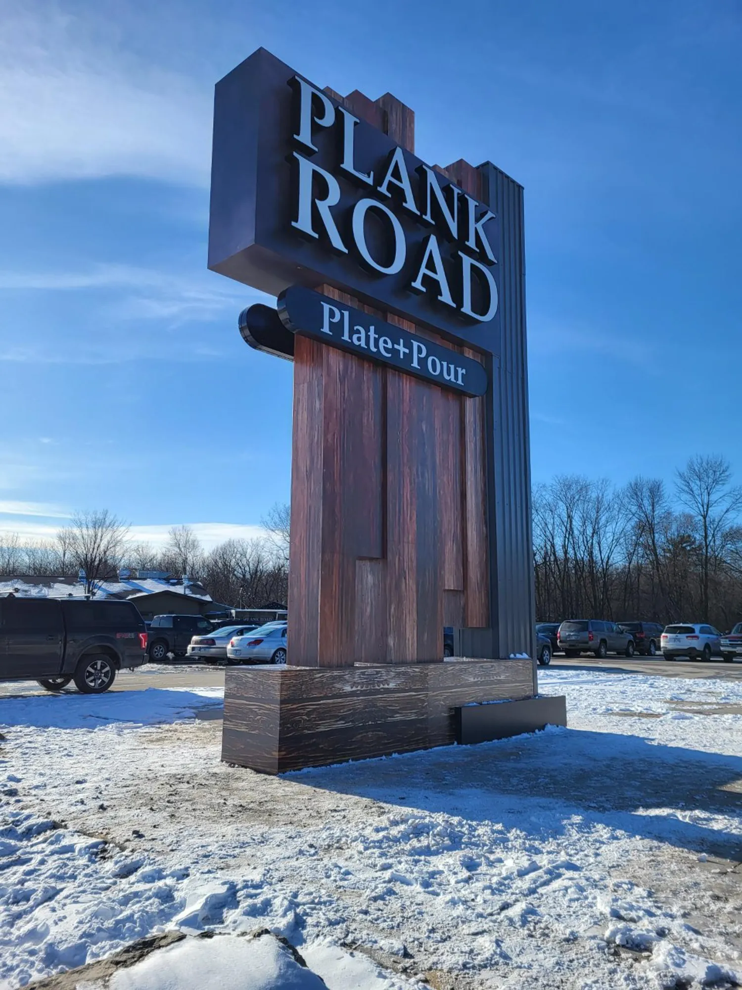 Jones crafted a unique sign that seamlessly blends history with modern design elements for the Plank Road Plate + Pour.
